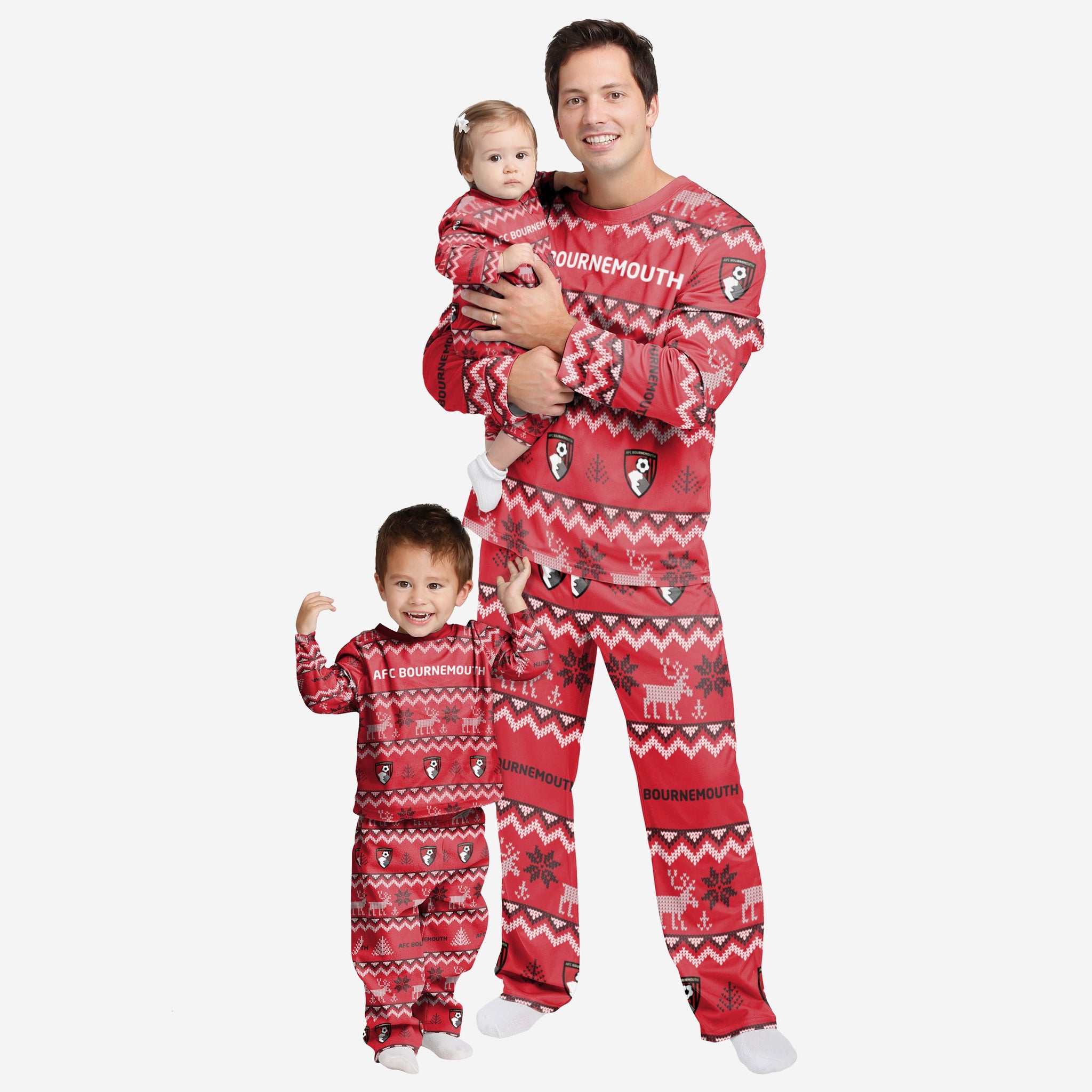 Get your young fan started early this holiday season in these AFC Bournemouth Infant Ugly Pattern Family Holiday Pyjamas! Your baby will absolutely love these matching Christmas pyjamas! Make sure your infant enjoys sweet dreams filled with holiday joy by having them sleep in infant pyjamas. Don’t forget to take your holiday photo with the whole family wearing matching Christmas pyjamas!