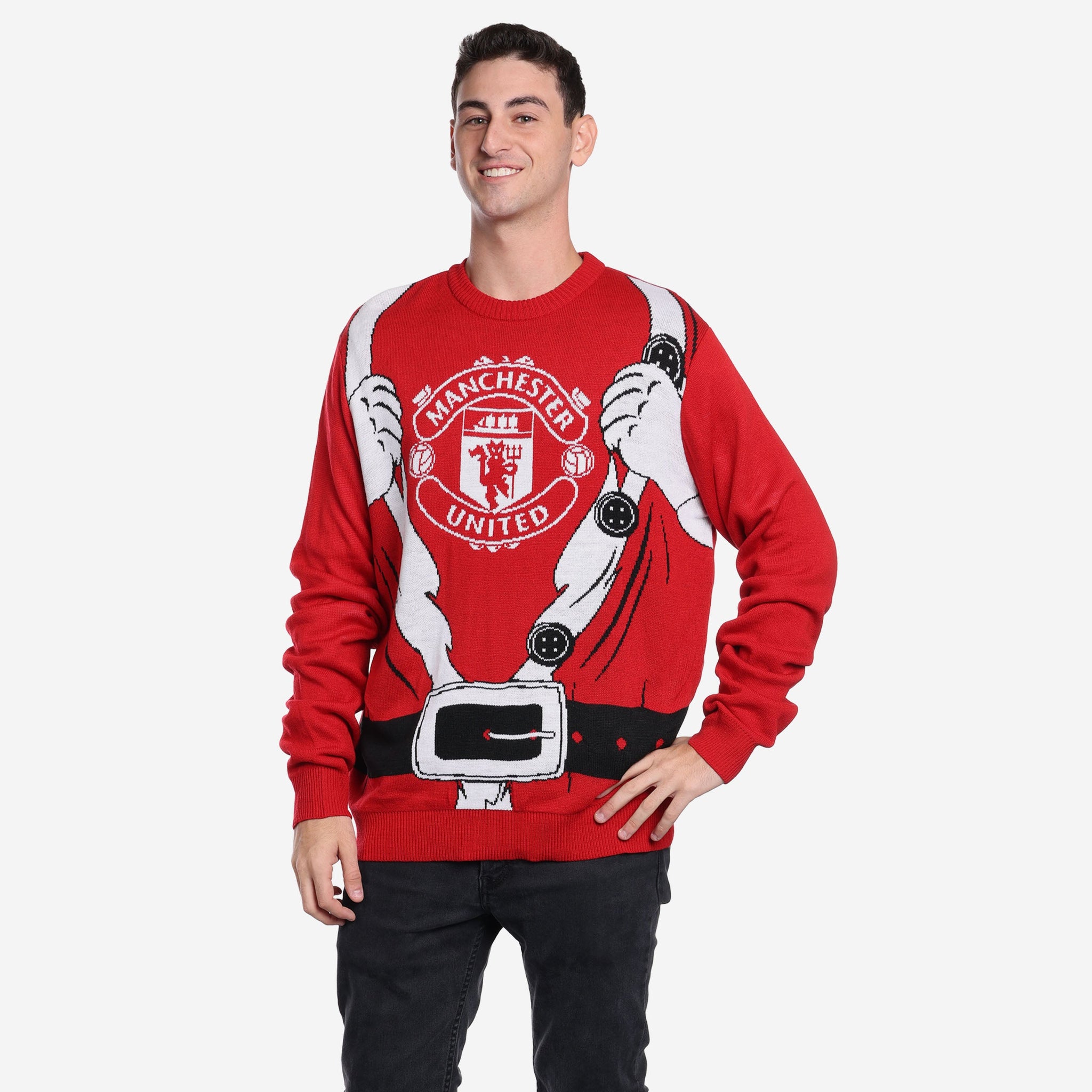 While you might not live at the North Pole, work with a team of elves, or have nine flying reindeer at your disposal, you and Santa have more in common than you might think. For example, you both love milk and cookies. After all, who doesn't? Also, you both love your team! Celebrate your shared club pride in style with the Manchester United FC Santa is a Fan Christmas Jumper.