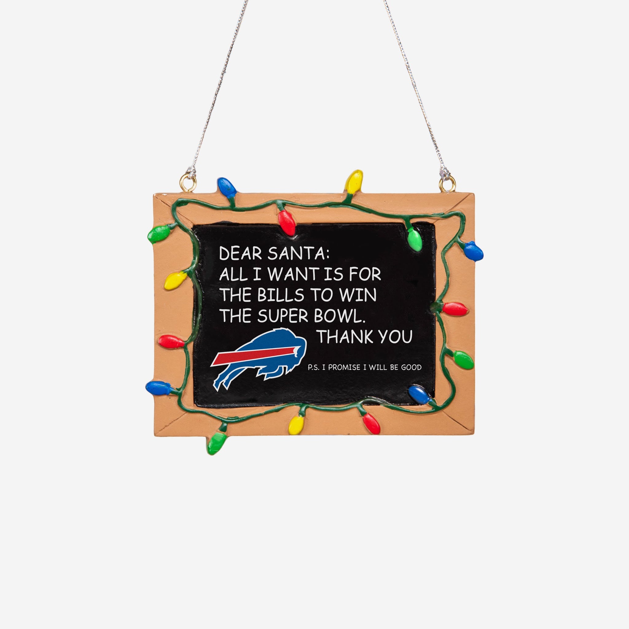 So, you made your list and sent it to jolly ol' Fanta Claus, but sometimes letters can get lost in the mail. Just in case, put this Buffalo Bills Resin Chalkboard Sign Ornament on your tree to let him know how good you've been this year, and that all you want for the holidays is a trophy.